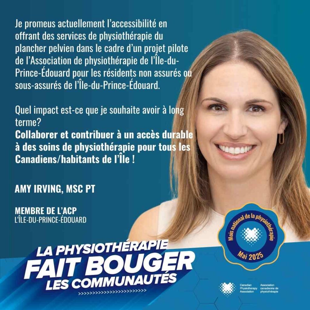 Je promeus actuellement l’accessibilité en offrant des services de physiothérapie du plancher pelvien dans le cadre d’un projet pilote de l’Association de physiothérapie de l’Île-du-Prince-Édouard pour les résidents non assurés ou sous-assurés de l’Île-du-Prince-Édouard. Le conseil d’administration de l’Association de physiothérapie de l’Île-du-Prince-Édouard a fait des démarches pour que tous les résidents aient un accès équitable à la physiothérapie du plancher pelvien dans le cadre de ce projet.