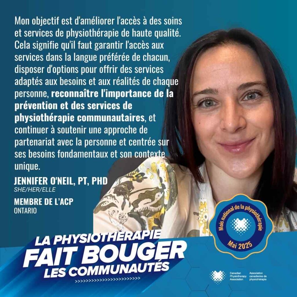 Mon objectif est d’améliorer l’accès à des soins et services de physiothérapie de haute qualité. Cela signifie qu’il faut garantir l’accès aux services dans la langue préférée de chacun, disposer d’options pour offrir des services adaptés aux besoins et aux réalités de chaque personne, reconnaître l’importance de la prévention et des services de physiothérapie communautaires, et continuer à soutenir une approche de partenariat avec la personne et centrée sur ses besoins fondamentaux et son contexte unique.