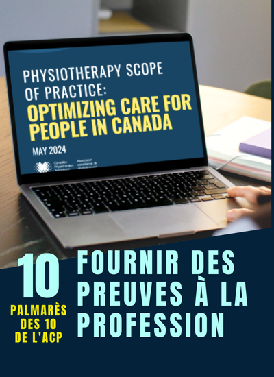 Ensemble, nous avons réuni des voix de partout au pays pour créer trois rapports historiques : Champ de pratique de la physiothérapie, Répercussions économiques de la physiothérapie au Canada et Définir l’avenir des soins en physiothérapie au Canada : consultation publique sur l’accès, les normes et le champ de pratique. Ces rapports prouvent que le fait d’élargir l’accès à la physiothérapie n’améliore pas simplement des vies, cela renforce aussi tout le système de santé et permet de faire des économies de milliards de dollars.